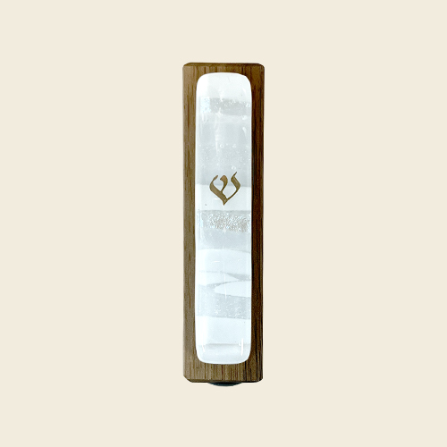 This compact mezuzah is handcrafted from a walnut plank and features our signature fused glass and gold shin on the front. Inspired by the prism of Kaballah, white is for compassion. All of our wooden mezuzot are sealed against weather and use no paints or stains, highlighting only the natural beauty of the wood. Features an adhesive backing to be easily mounted to almost any doorway.