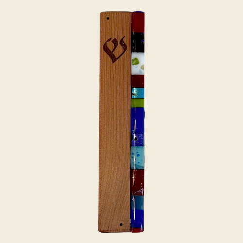 Handcrafted wood, this piece features a fused glass inlay and a laser-engraved shin. All of our wooden mezuzot are sealed against weather and use no paints or stains, highlighting only the natural beauty of the wood. Nail holes for mounting and a scroll compartment in the back.